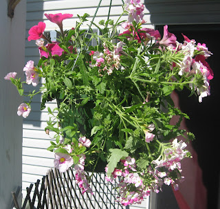 This planter has a nice geranium, white pansy, pink daisy, and this great-smelling dianthus...